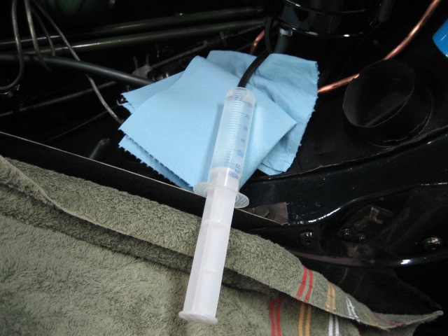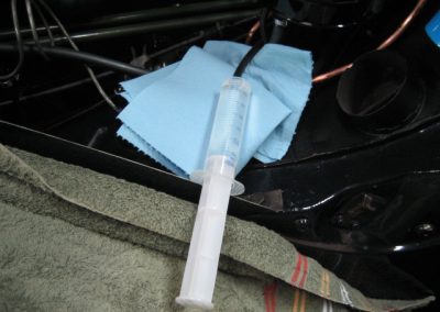 Le tube de retour quasiment bouché me fait penser qu’il pourrait expliquer la fuite au niveau de correcteur de hauteur, alors je nettoie toute la ligne de retour avec de l’alcool méthylique, parce que je suspecte qu’il contient encore des traces de liquide rouge
