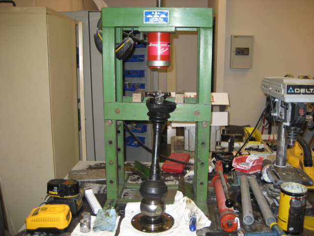 Normalement il faut un extracteur spécial pour déposer les tri-axes, mais avec une presse c’est possible aussi. Celle que je peux utiliser au boulot, ici, est trop courte pour me permettre de reposer le tri-axes après remplacement des soufflets…